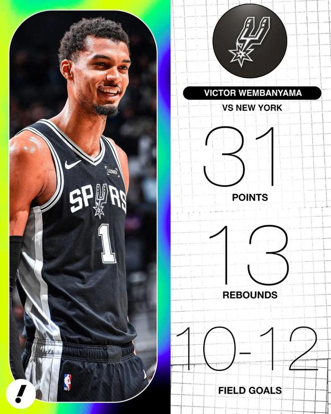 这是两队自NBA杯决赛后的第一次碰面,马刺成功完成复仇,当家球星文班亚马首发只打了不到24分钟,投篮12中10,三分2中2,罚球10中9,拿下31分13篮板,正负值高达+17。