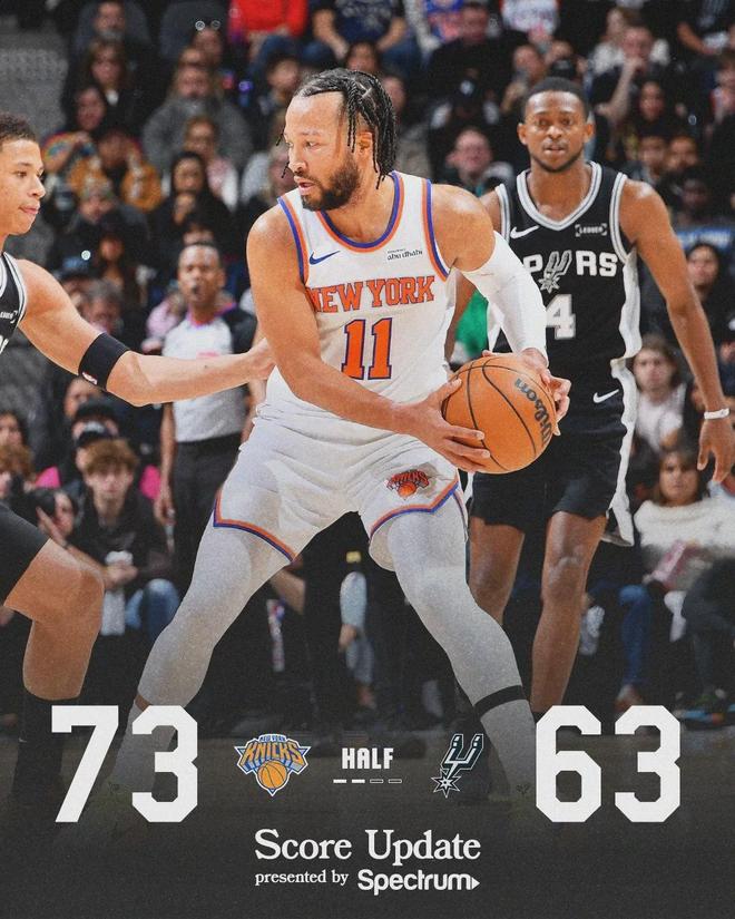 第二节尼克斯一度领先到19分,眼看比赛要花,文班亚马站了出来,连得9分+摘帽布伦森。第二节尼克斯28-27单节净胜马刺1分,半场战罢,尼克斯73-63领先整整10分。文班9中7,半场砍下21分8篮板;唐斯得到15分4板3助。