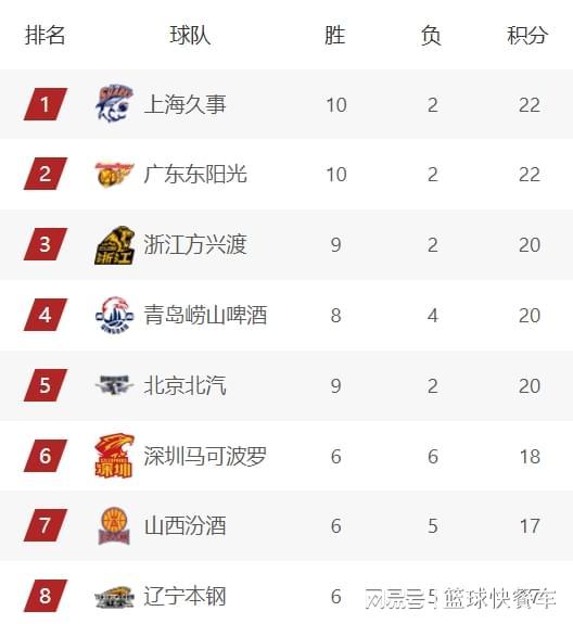 排在积分榜第三名的是卫冕冠军广厦队,目前,广厦的战绩是9胜2负。而积分榜第四名则是青岛队,他们这一轮比赛在主场遭到上海队暴揍,最终以17分的巨大分差惨败给对手。在输掉这一场比赛后,青岛队的战绩变成8胜4负。不过,凭借着先赛一场的优势,青岛队暂时排在积分榜第四名。而北京队的战绩虽然是9胜2负,不过,由于少赛一场的缘故,他们暂时被挤出前四名,排在积分榜第五名。
