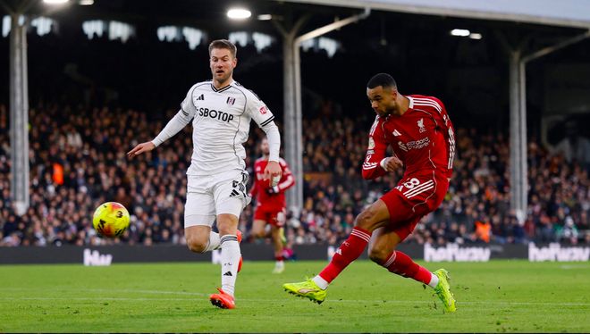 1分钟后,利物浦的角球制造威胁,麦卡利斯特的头球砸在横梁上,富勒姆逃过一劫。