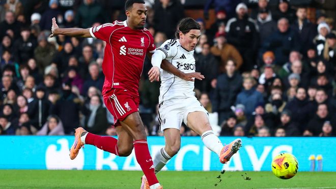 第77分钟,富勒姆的长传令利物浦防线一片慌乱,威尔逊面对空门选择吊射,皮球砸在立柱上,被范迪克解围。